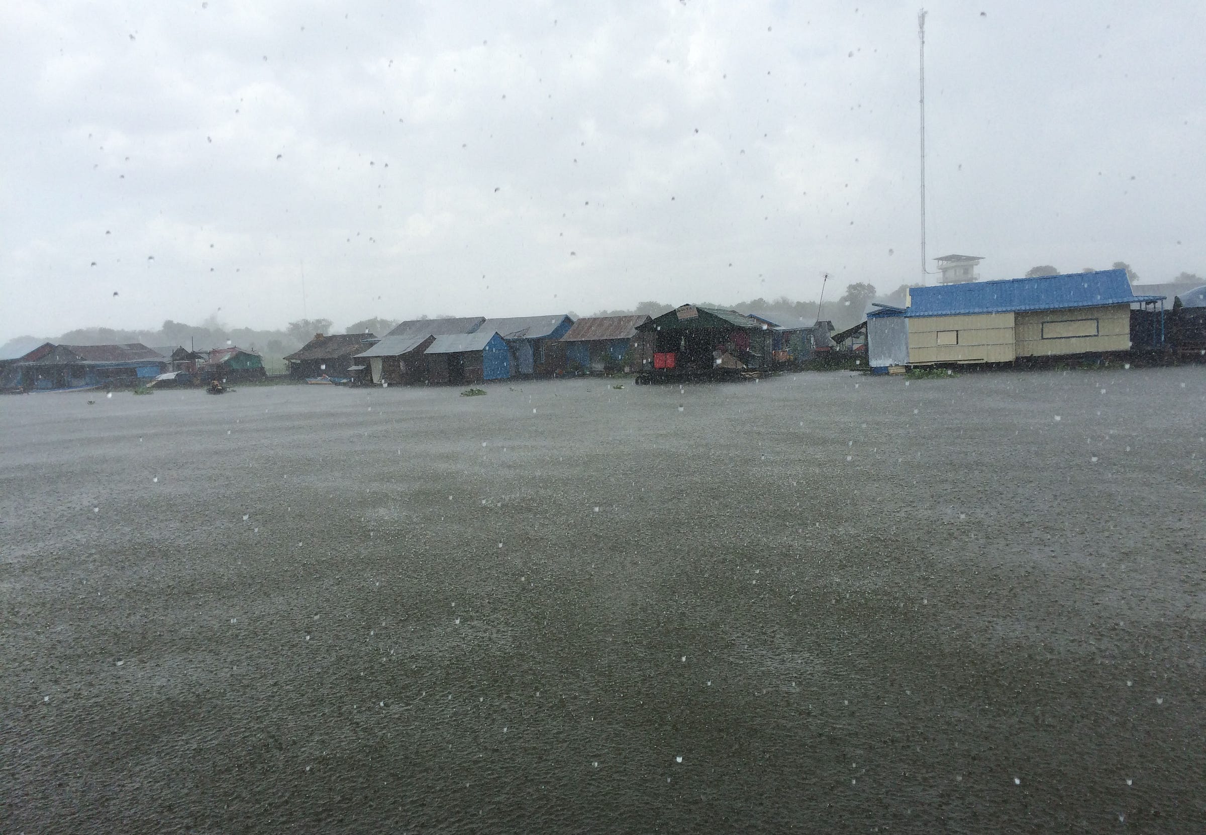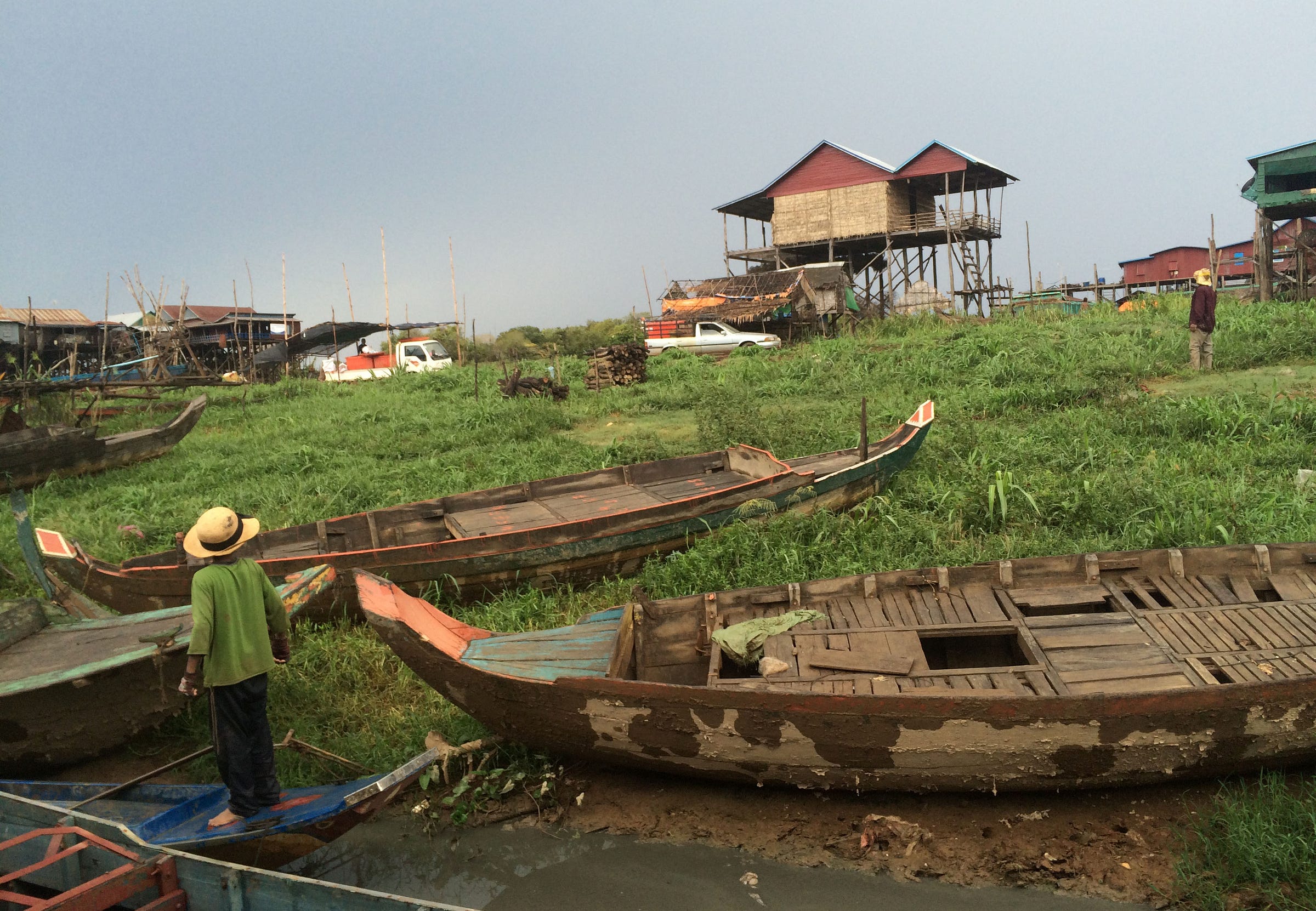 On a drizzly April afternoon, Ly Oeu sips an iced coffee and considers how his life has changed since he left the water two years earlier. In 2015 he moved with his family and neighbors from a nearby floating village to this dusty, new community on a steep bank near the bottom of the lake. Here, just a few miles outside of Kampong Chhnang city, plots were cheap enough that the fifteen families could just about manage to afford them. The river is only a few hundred yards away, but the ground is so high we can’t see it from here. Instead, there’s a view of Phnom Kong Rei—the poignant slopes a hazy blue-green in the distance.